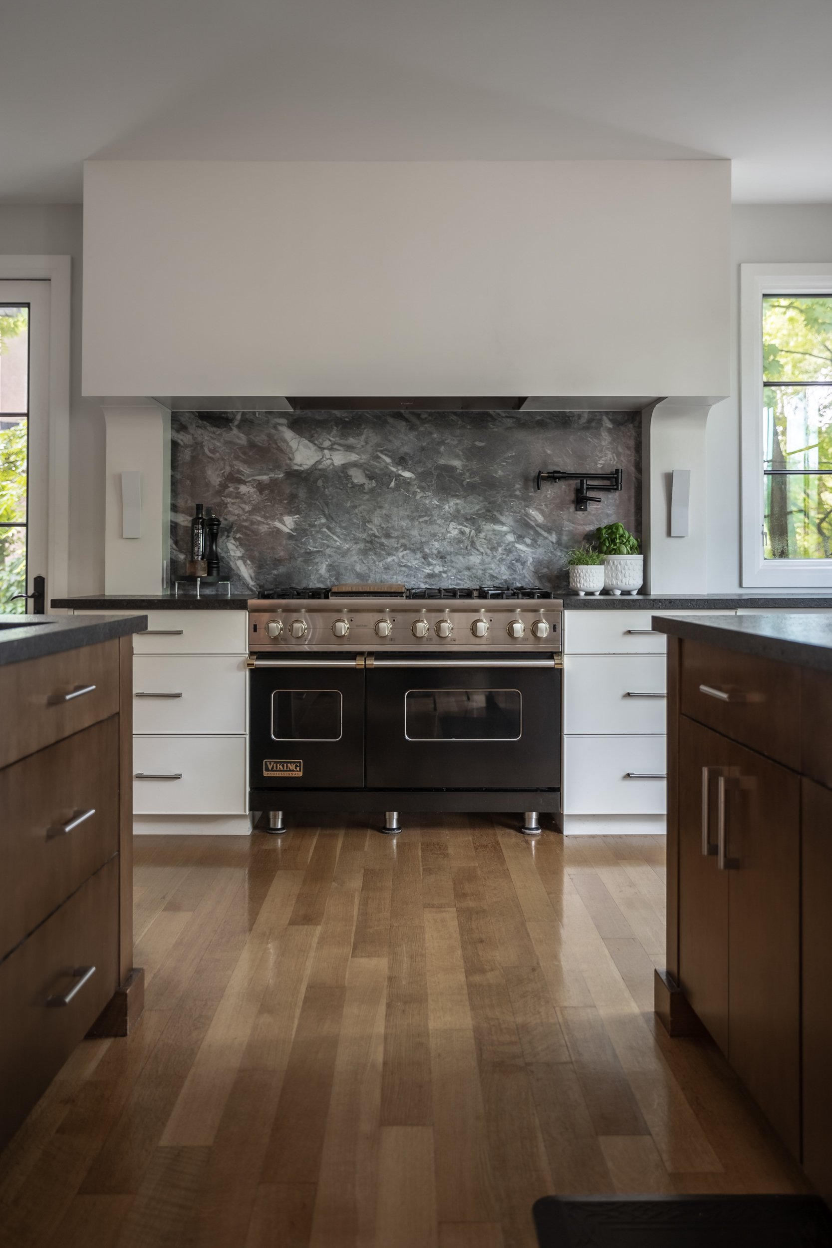 The interior renovation of this Oakville property transformed key spaces with a focus on both style and functionality. The master ensuite was fully upgraded, featuring modern fixtures and luxurious finishes, creating a serene, spa-like retreat. The Jack & Jill bathroom was reimagined to enhance privacy and convenience, while the guest ensuite received a thoughtful redesign. A standout feature of the kitchen is the custom-designed hood, crafted to perfectly complement the range and elevate the overall aesthetic of the space. In the living room, a custom wood mantel was added to frame the fireplace, bringing warmth and character to the room. These upgrades blend practicality with elegance, enhancing the home's overall appeal.